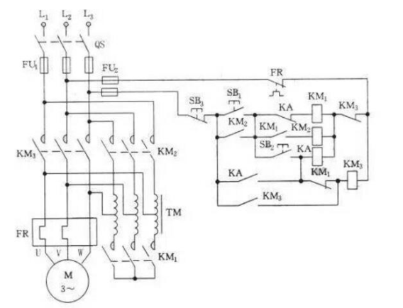 控製器:由KM1,KM2,KM2接觸器,KT,中間繼電器KA和SB1、SB4和起動按鈕SB2、SB3組成。二個啟動按鈕並聯,兩個停機按鈕串聯組成了兩地控製功能。SB1、SB3(虛線框)組成了甲地控製的啟動,停止按鈕。SB4,SB2組成了控製的啟動,停止按鈕。