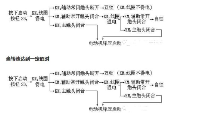 接觸器KM1降壓起動時,接觸器KM2和中間繼電器KA不工作,時間斷電器KT工作正常。線路進入全壓運行後,情況正相反,接觸器KM2和中間斷電器KA工作,觸點KM1和時間繼電器KT不工作。
