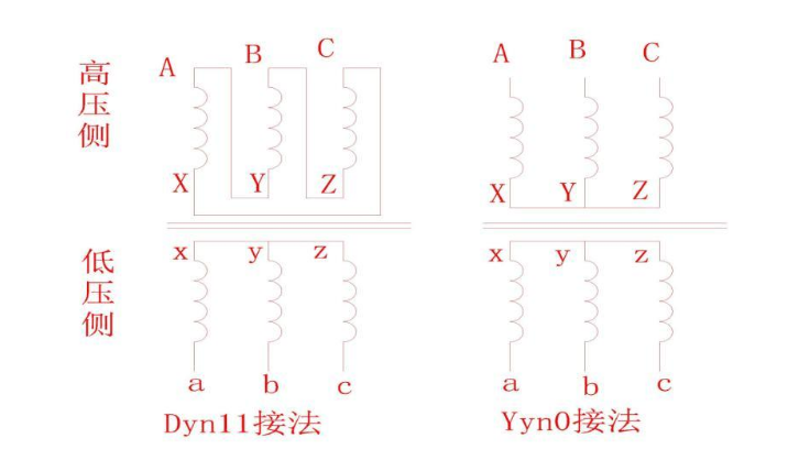 變壓器Dyn11連接方式:高壓側三角形、低壓側星形、中性線,高壓與低壓相差30度。變壓器Yyn0連接方式:高壓側星形、低壓側星形、中性線,高壓與低壓無相差。