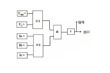複合電壓過流保護由複合電壓元件、過流元件和時間元件組成。保護接入電流為變壓器本側CT二次三相電流,接入電壓為變壓器本側或其他側PT二次三相電壓。對於微機保護,本側電壓可以通過軟件提供給其他側,以確保任何一側的PT維護仍然可以使用複壓過流保護。如下圖所示,動作邏輯。