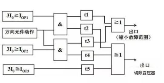 如圖所示,零序方向電流保護I段或II段動作後,首先通過短延時t1或t3跳母聯或跳本側開關,以縮小故障影響範圍,如果故障量仍然存在,則通過長延時t2或t4跳三側開關切除變壓器。無方向的III段,通過延遲直接切除變壓器。