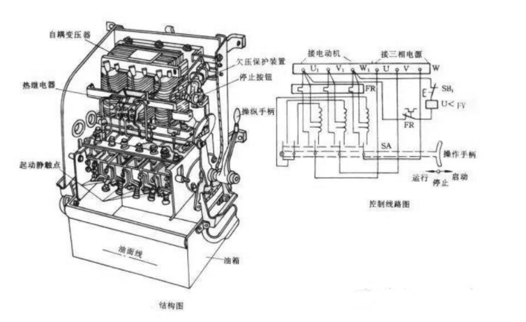 采用手動控製的補償器主要有QJ3。QJ3型起動補償器結構圖和控製線路圖如下: