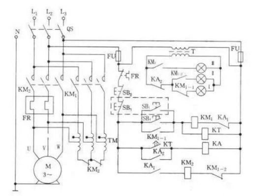 控製器:由KM1,KM2,KM2接觸器,KT,中間繼電器KA和SB1、SB4和起動按鈕SB2、SB3組成。二個啟動按鈕並聯,兩個停機按鈕串聯組成了兩地控製功能。SB1、SB3(虛線框)組成了甲地控製的啟動,停止按鈕。SB4,SB2組成了控製的啟動,停止按鈕。