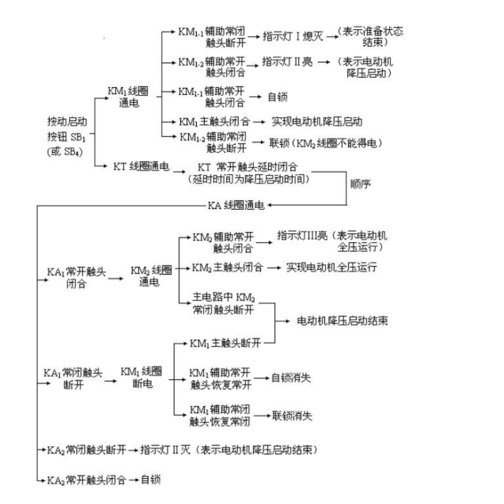 接觸器KM1降壓起動時,接觸器KM2和中間繼電器KA不工作,時間斷電器KT工作正常。線路進入全壓運行後,情況正相反,接觸器KM2和中間斷電器KA工作,觸點KM1和時間繼電器KT不工作。